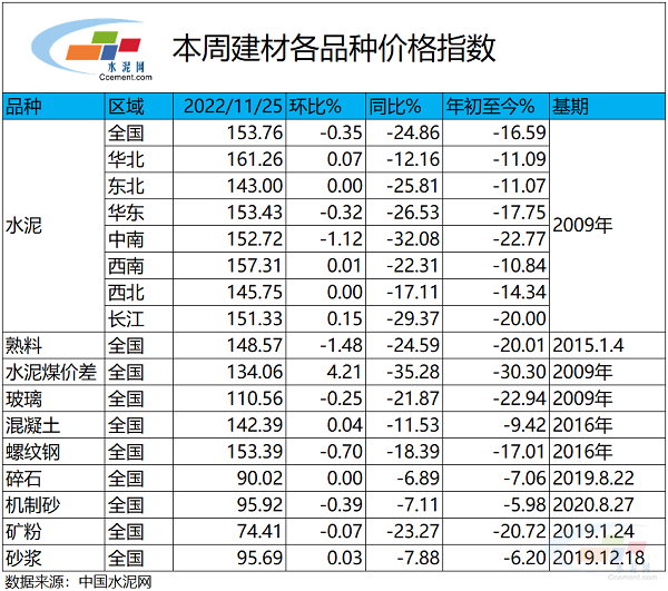 本周五,全國(guó)水泥價(jià)格指數(shù)為153.76點(diǎn),環(huán)比下跌0.35%,同比下跌24.86%;熟料價(jià)格指數(shù)為148.57點(diǎn),環(huán)比下跌1.48%,同比下跌24.59%;水泥煤價(jià)差指數(shù)為134.06點(diǎn),環(huán)比上漲4.21%,同比下跌35.28%;玻璃價(jià)格指數(shù)為110.56點(diǎn),環(huán)比下跌0.25%,同比下跌21.87%;混凝土指數(shù)為142.39點(diǎn),環(huán)比上漲0.04%,同比下跌11.53%;螺紋鋼價(jià)格指數(shù)為153.39點(diǎn),環(huán)比下跌0.70%,同比下跌18.39%;碎石價(jià)格指數(shù)為90.02點(diǎn),環(huán)比持平,同比下跌6.89%;機(jī)制砂價(jià)格指數(shù)為95.92點(diǎn),環(huán)比下跌0.39%,同比下跌7.11%;礦粉價(jià)格指數(shù)為74.41點(diǎn),環(huán)比下跌0.07%,同比下跌23.27%;砂漿價(jià)格指數(shù)為95.69點(diǎn),環(huán)比上漲0.03%,同比下跌7.88%。