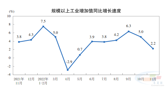 國家統計局發布11月份經濟數據。11月份,規模以上工業增加值同比實際增長2.2%(增加值增速均為扣除價格因素的實際增長率)。從環比看,11月份,規模以上工業增加值比上月下降0.31%。1—11月份,規模以上工業增加值同比增長3.8%。